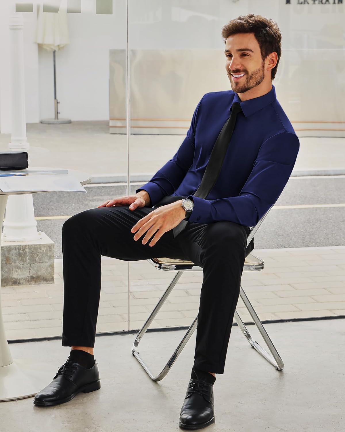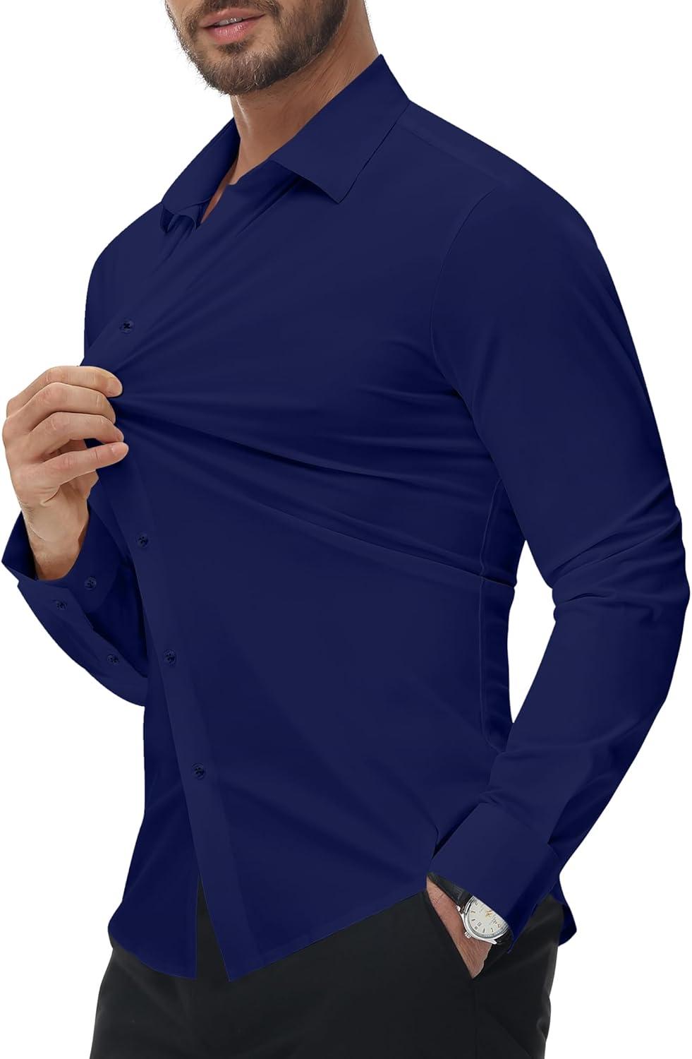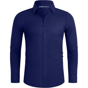 • Alimens & Gentle Stretch Mens Dress Shirts Slim Fit Long Sleeve Casual Skinny Muscle Fit Wrinkle Free Button Down Shirt(Navy Blue)