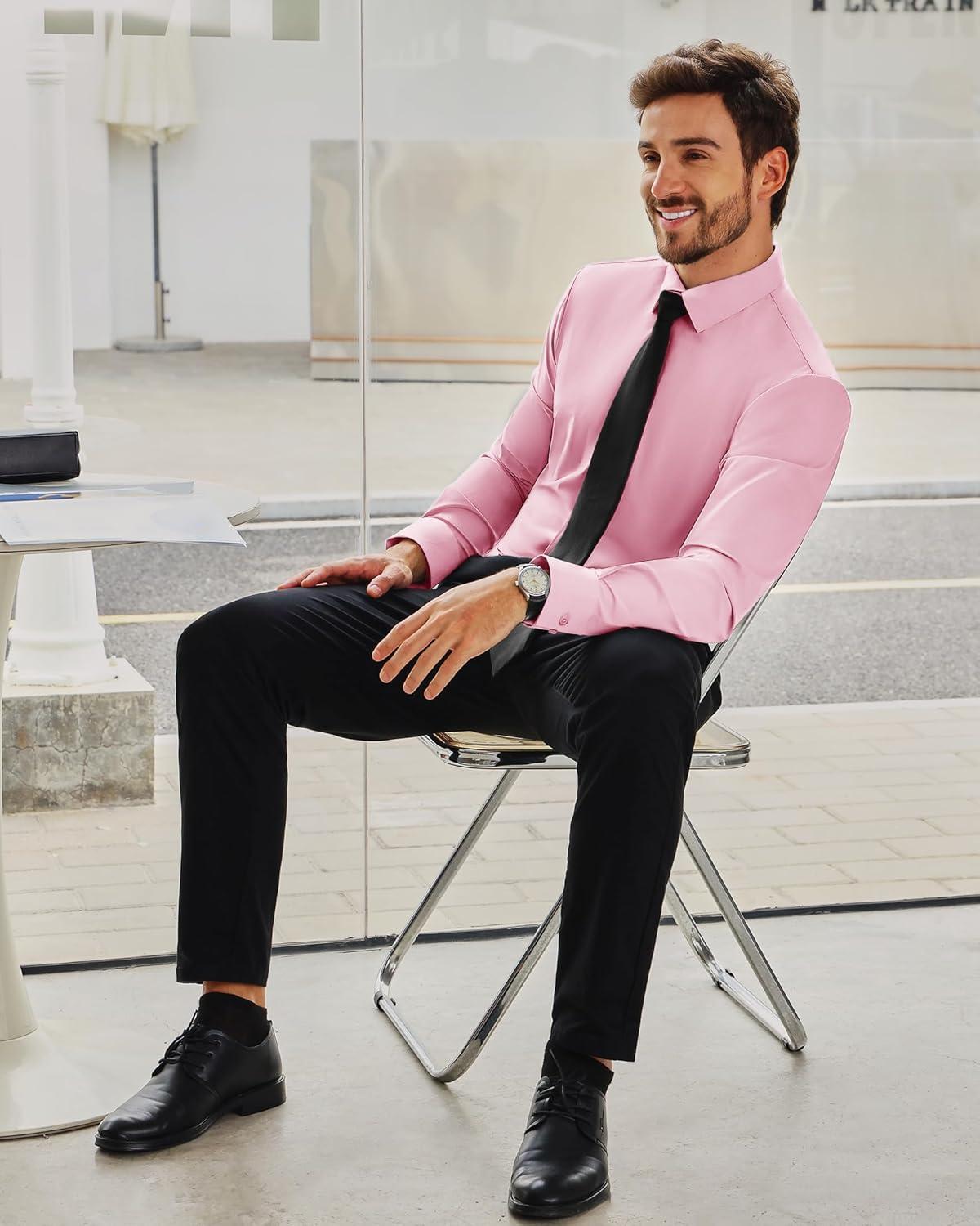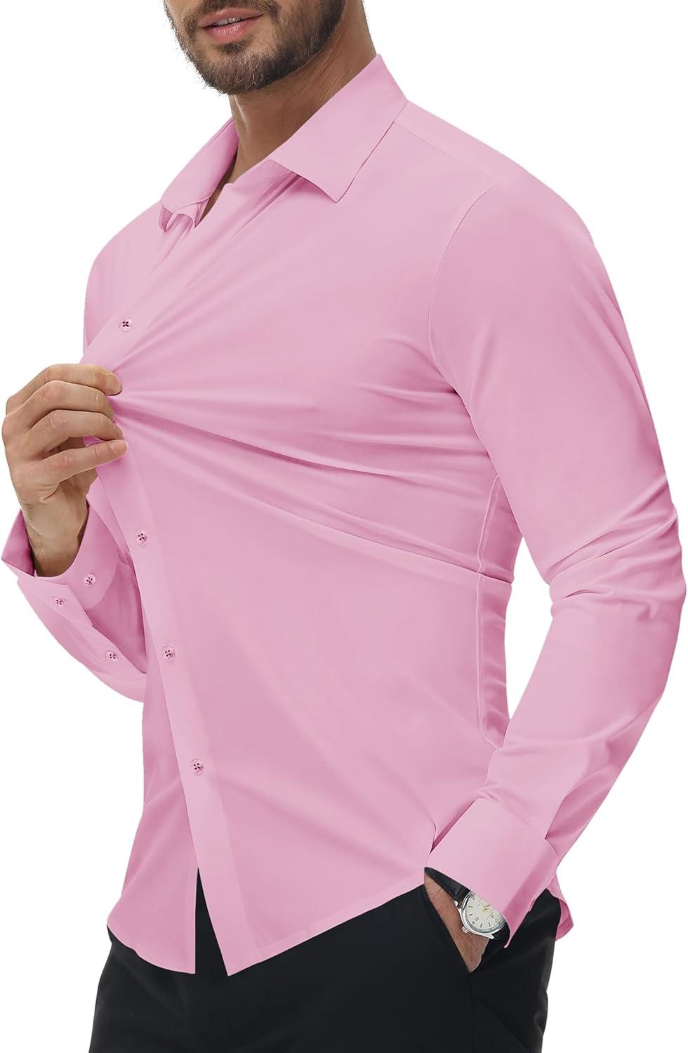 Alimens & Gentle Stretch Mens Dress Shirts Slim Fit Long Sleeve Casual Skinny Muscle Fit Wrinkle Free Button Down Shirt(Pink)