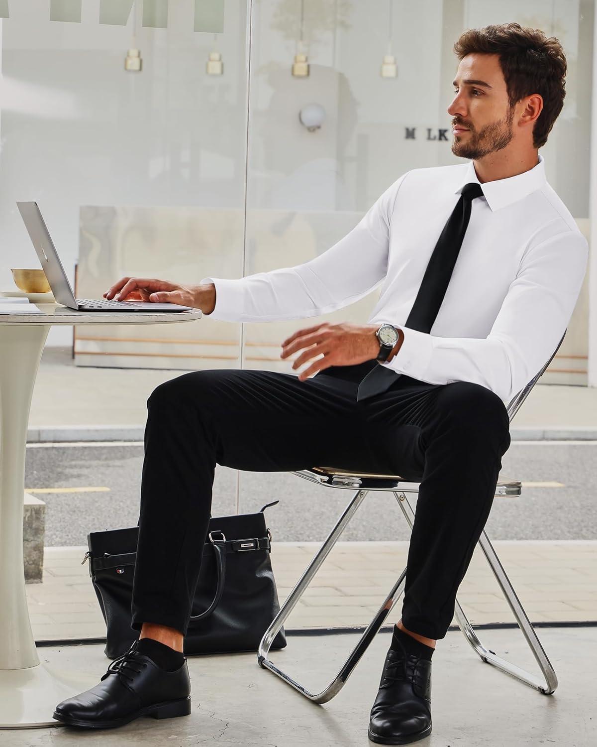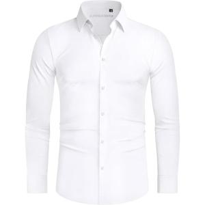 • Alimens & Gentle Stretch Mens Dress Shirts Slim Fit Long Sleeve Casual Skinny Muscle Fit Wrinkle Free Button Down Shirt(White)