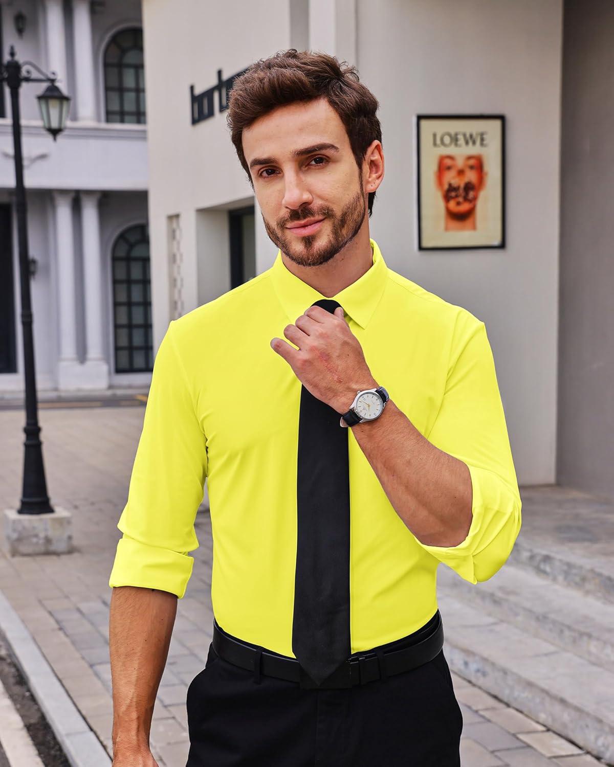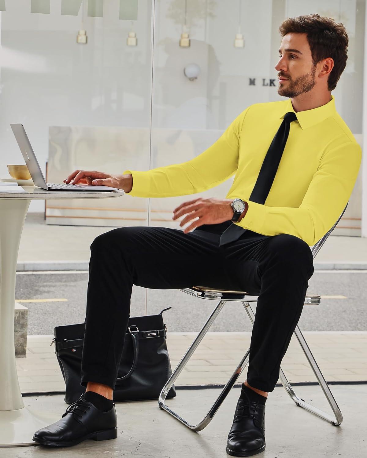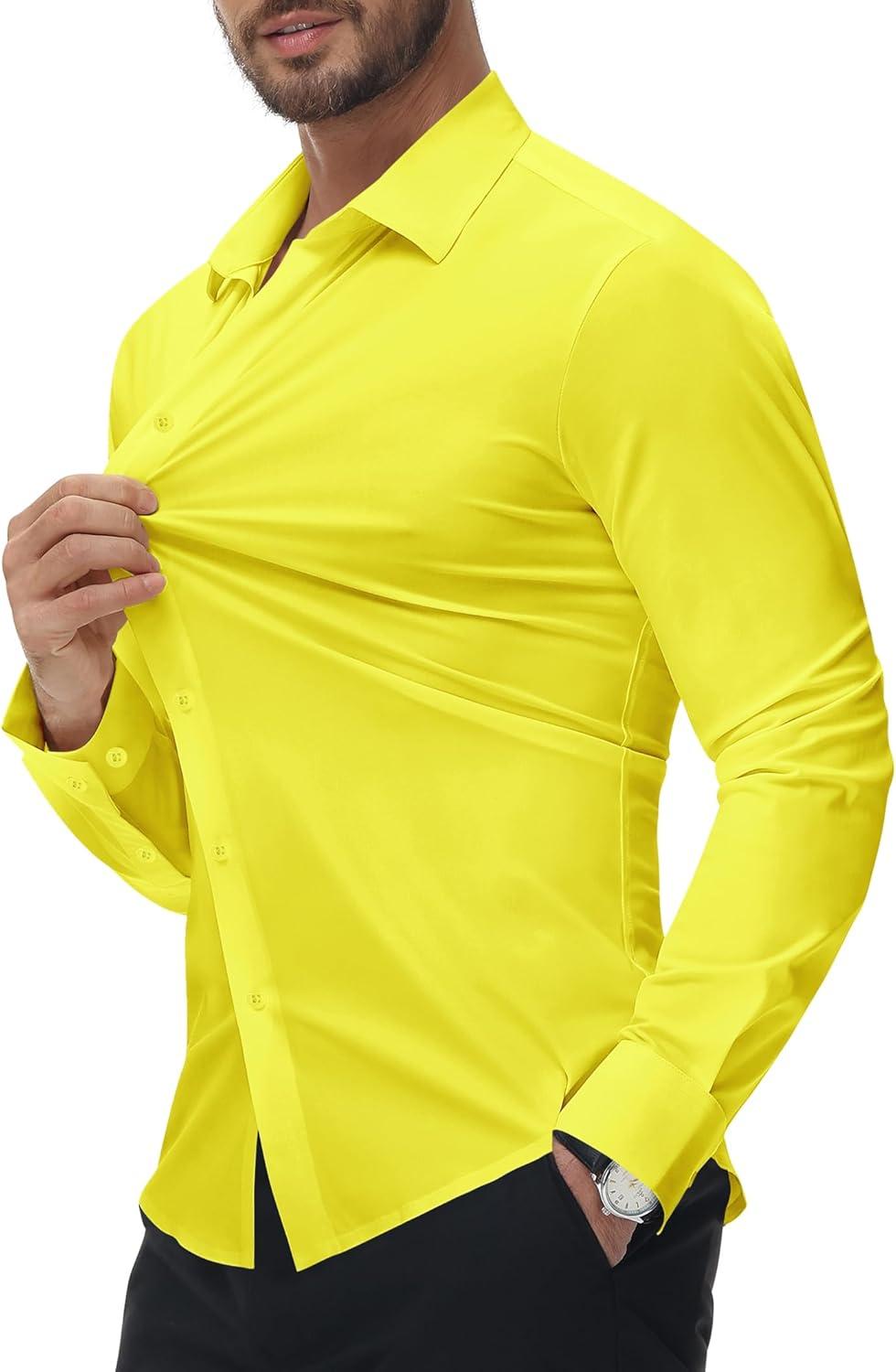 • Alimens & Gentle Stretch Mens Dress Shirts Slim Fit Long Sleeve Casual Skinny Muscle Fit Wrinkle Free Button Down Shirt(Yellow)