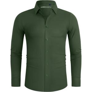 • Alimens & Gentle Stretch Mens Dress Shirts Slim Fit Long Sleeve Casual Skinny Muscle Fit Wrinkle Free Button Down Shirt(Olive)