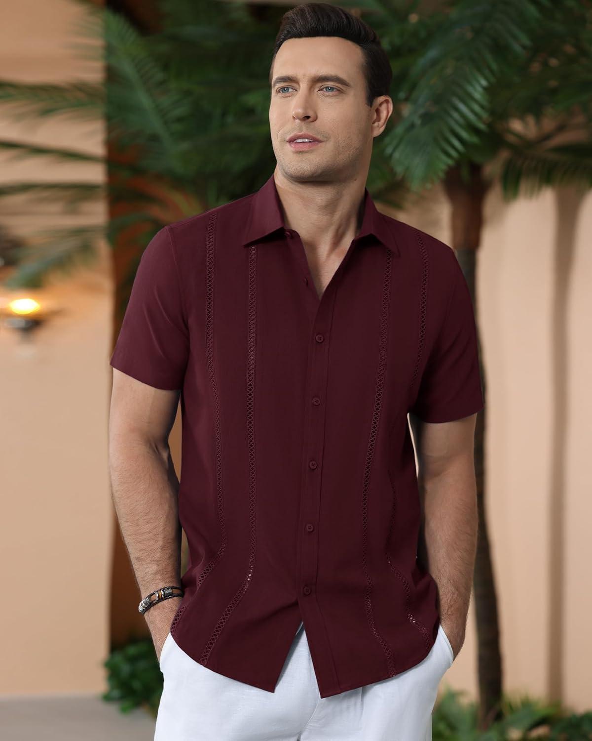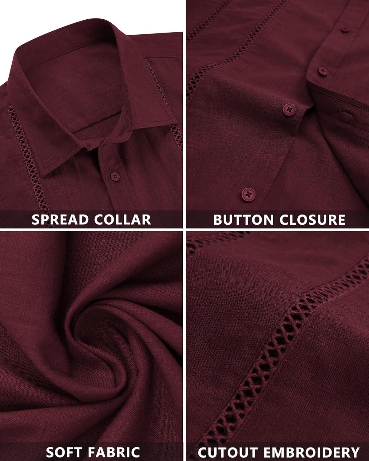 Alimens & Gentle Men’s Cuban Guayabera Shirts Cotton Linen Short Sleeve Button Down Shirts Casual Summer Beach Camp Shirt(Burgundy)