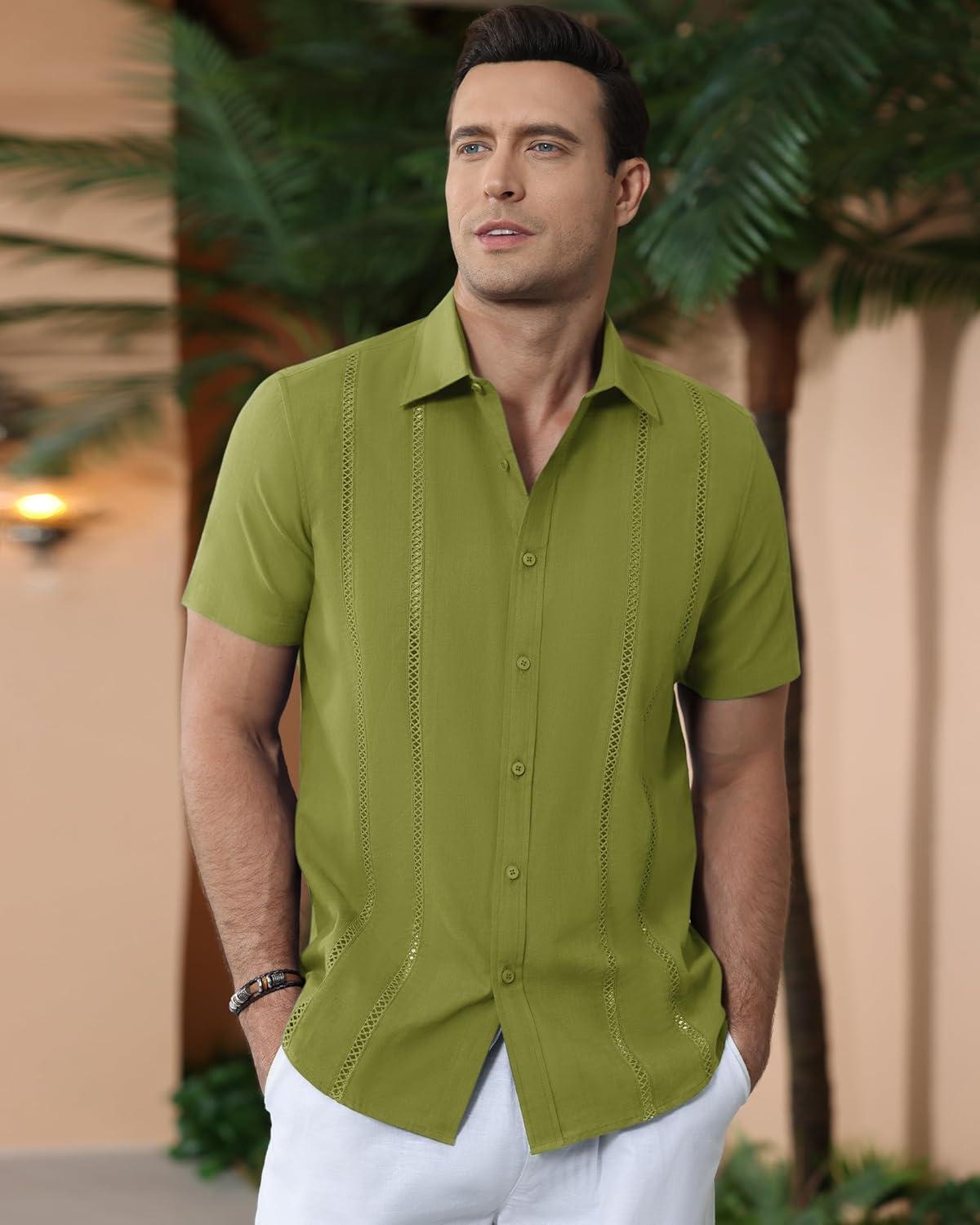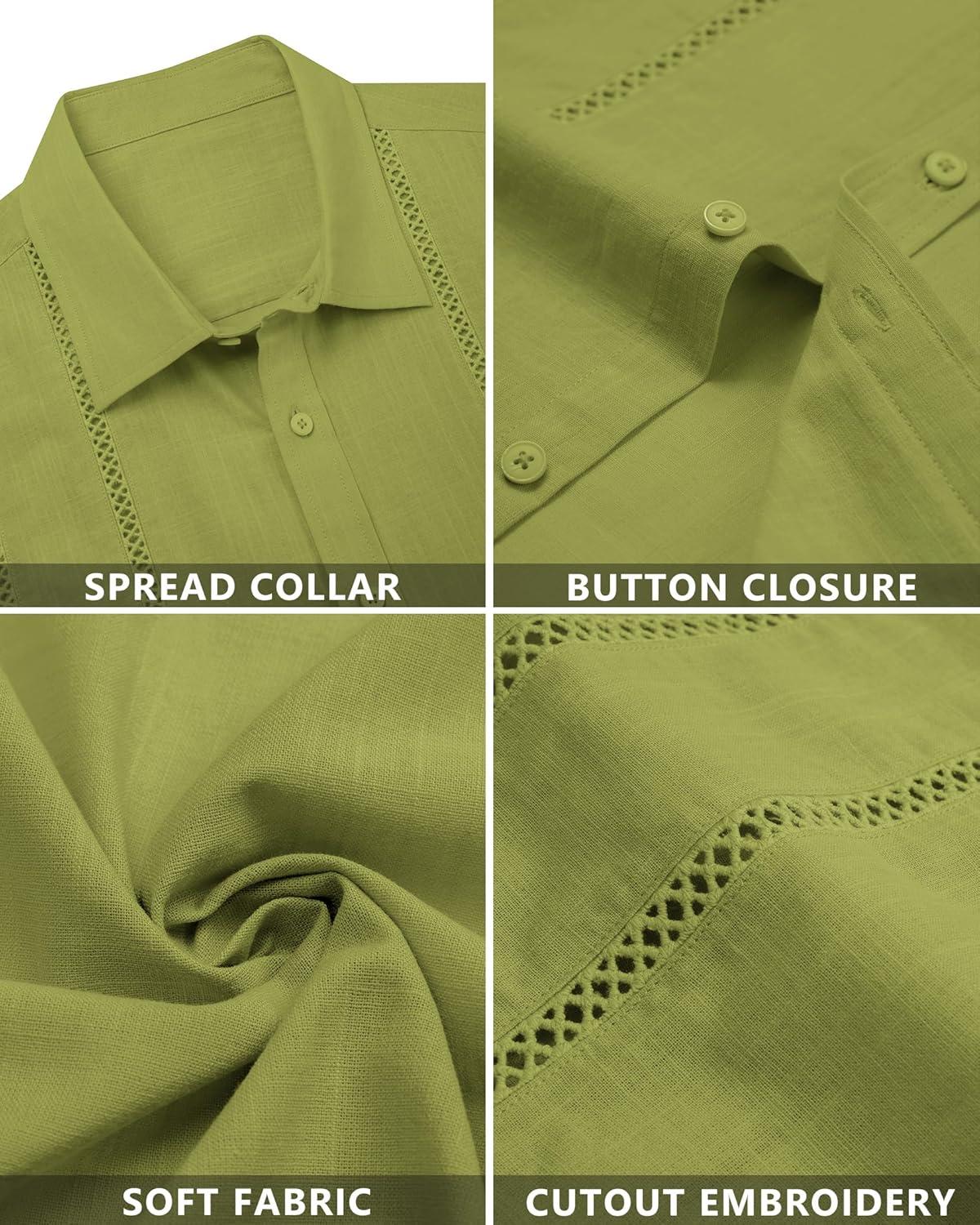 Alimens & Gentle Men’s Cuban Guayabera Shirts Cotton Linen Short Sleeve Button Down Shirts Casual Summer Beach Camp Shirt(Grass Green)