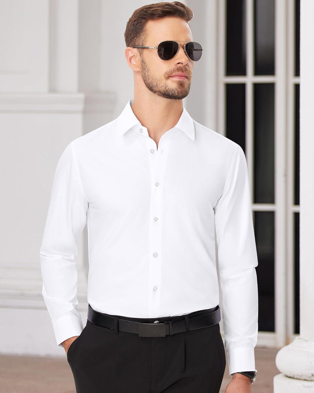 Alimens & Gentle Men’s Dress Shirts Long Sleeve Wrinkle Free Stretch Business Casual Wedding Button Down Shirt(Solid White)