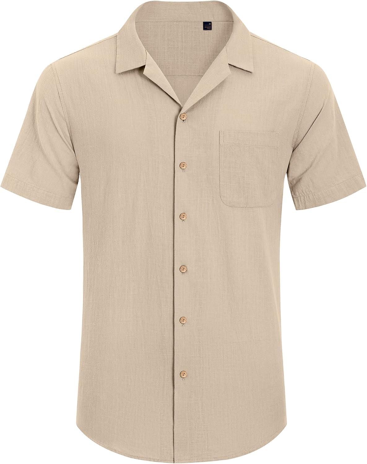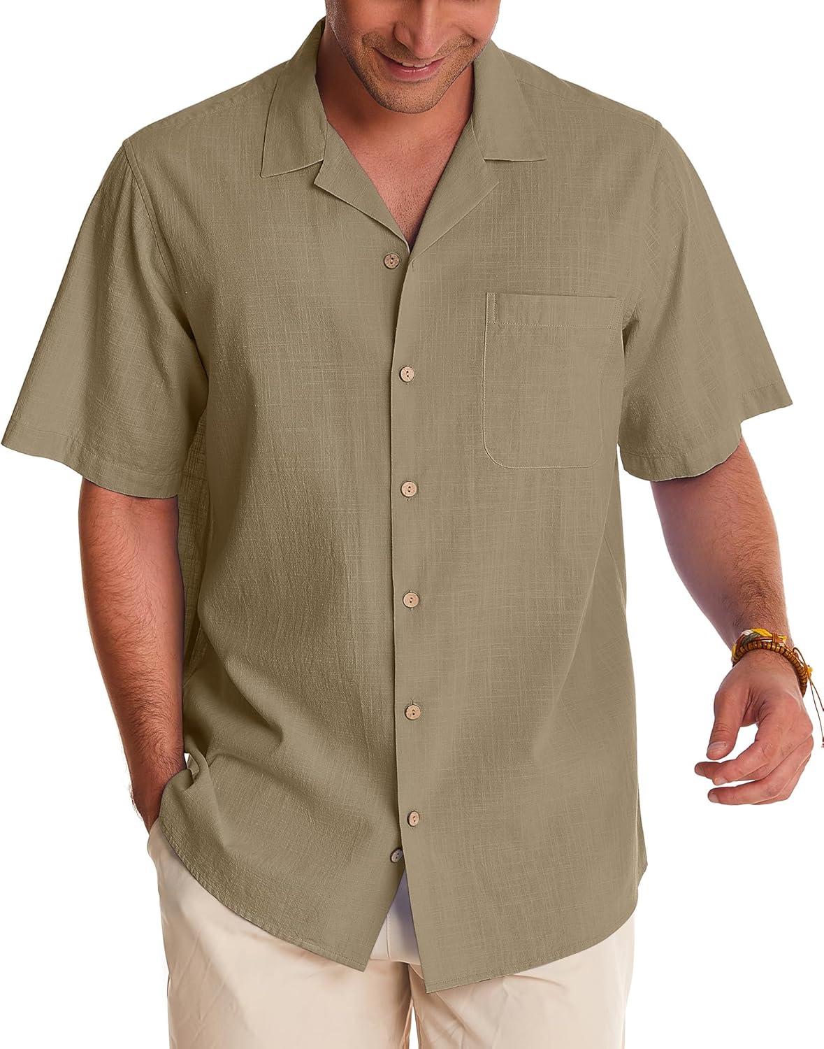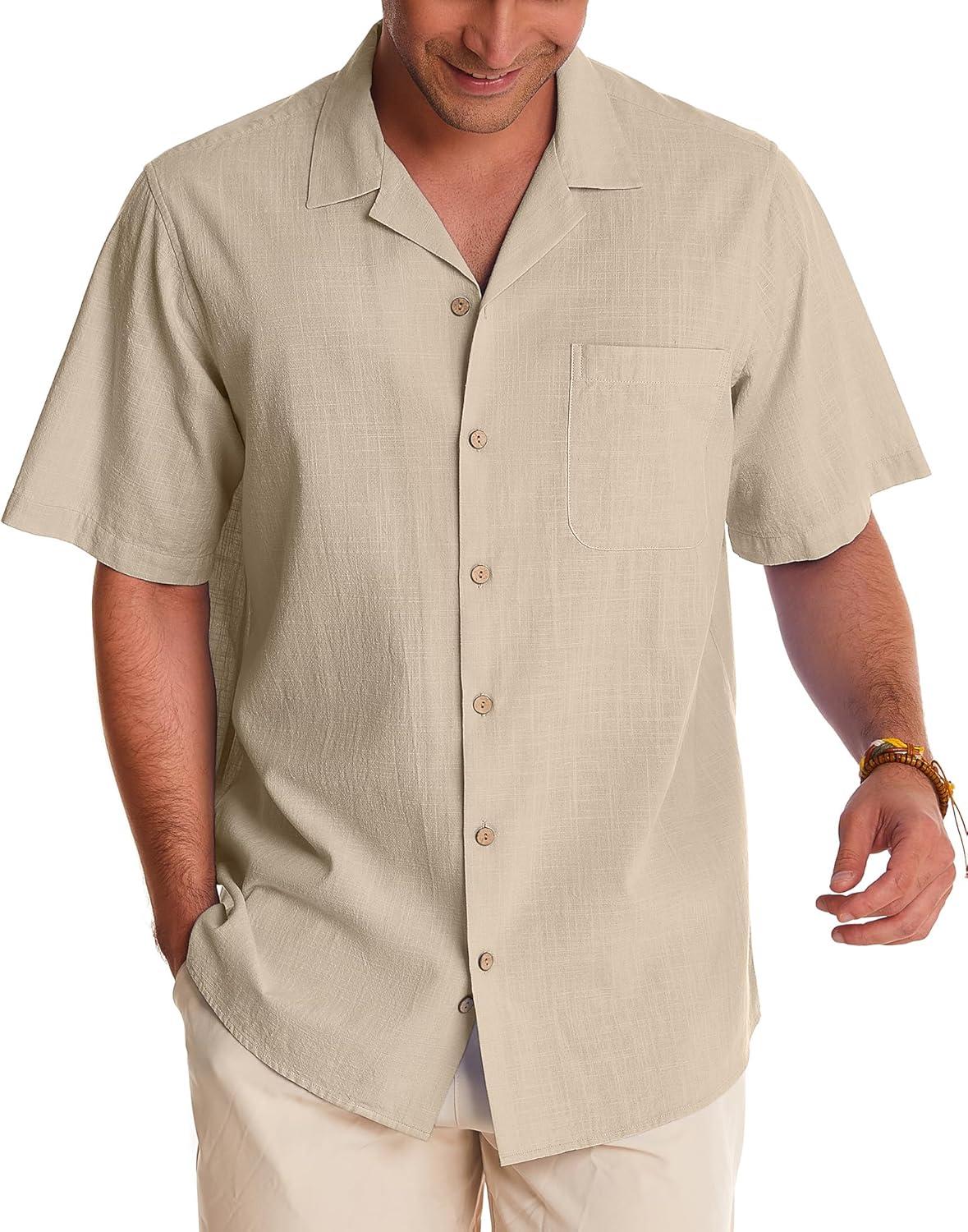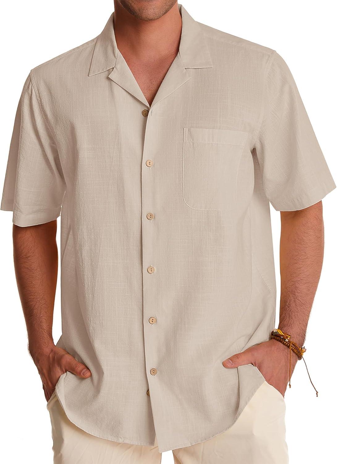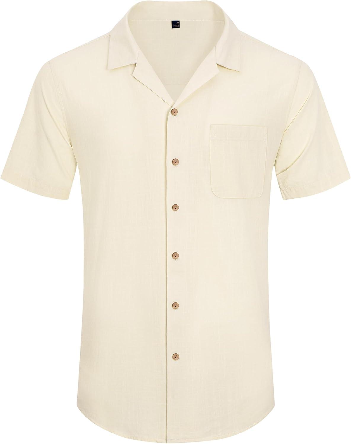 Alimens & Gentle Mens Linen Shirts Cotton Hawaiian Shirts Short Sleeve Button Down Shirts Casual Summer Beach Tops(Beige)