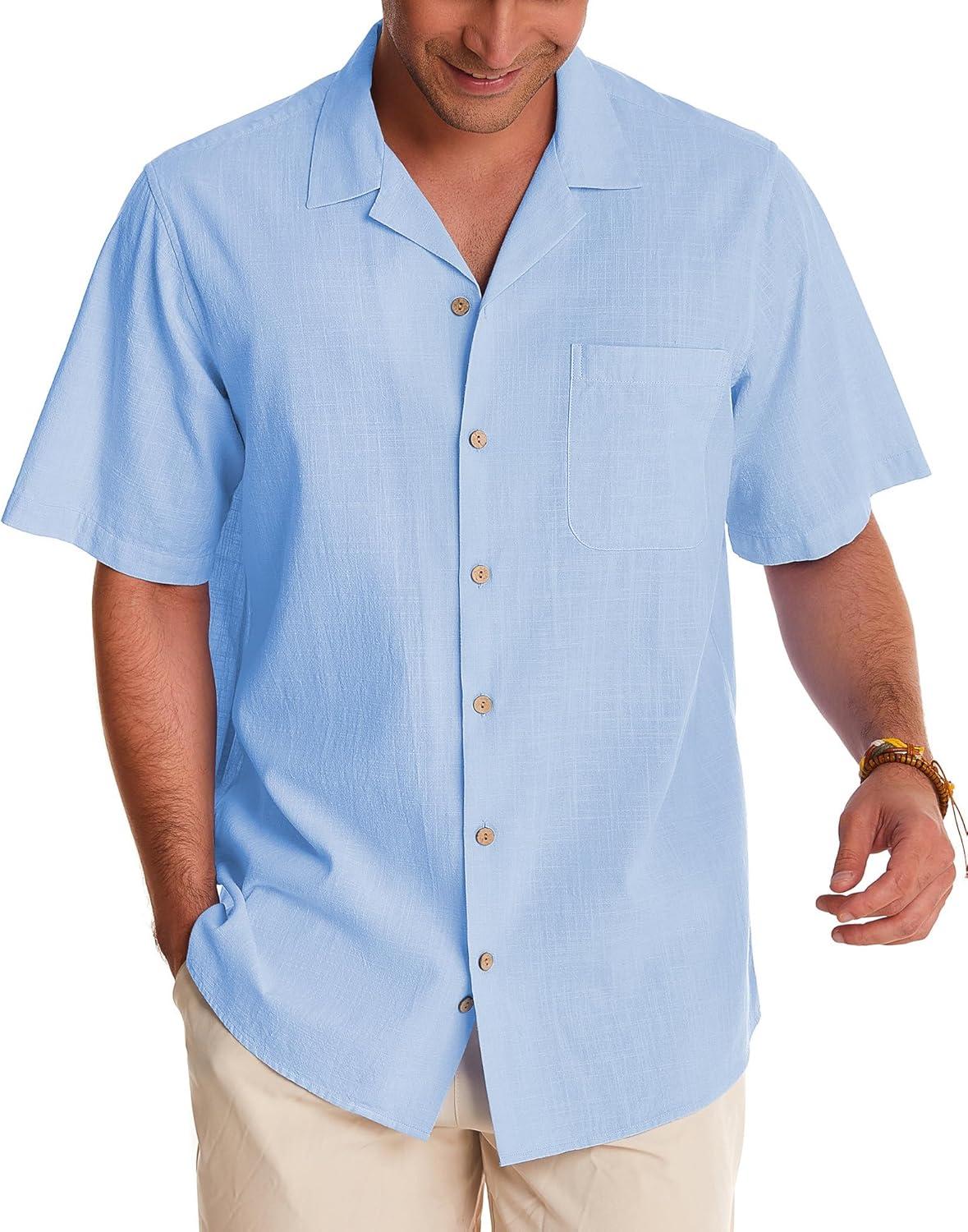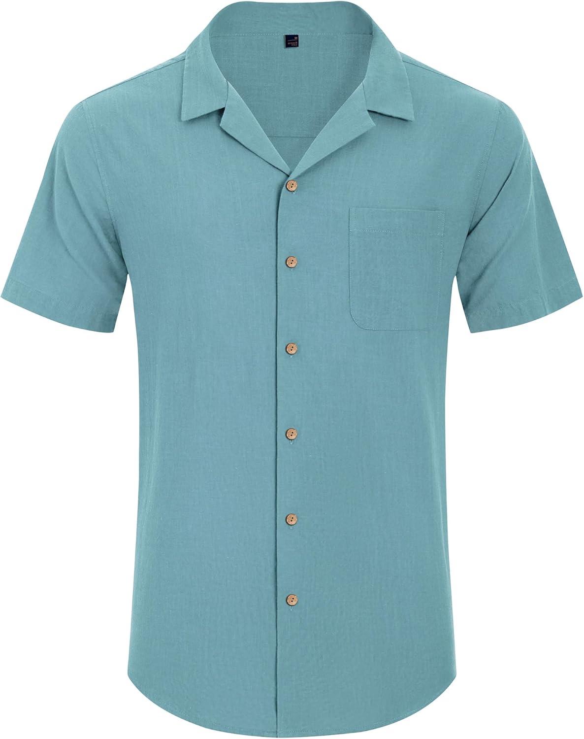 Alimens & Gentle Mens Linen Shirts Cotton Hawaiian Shirts Short Sleeve Button Down Shirts Casual Summer Beach Tops(Horizon Blue)