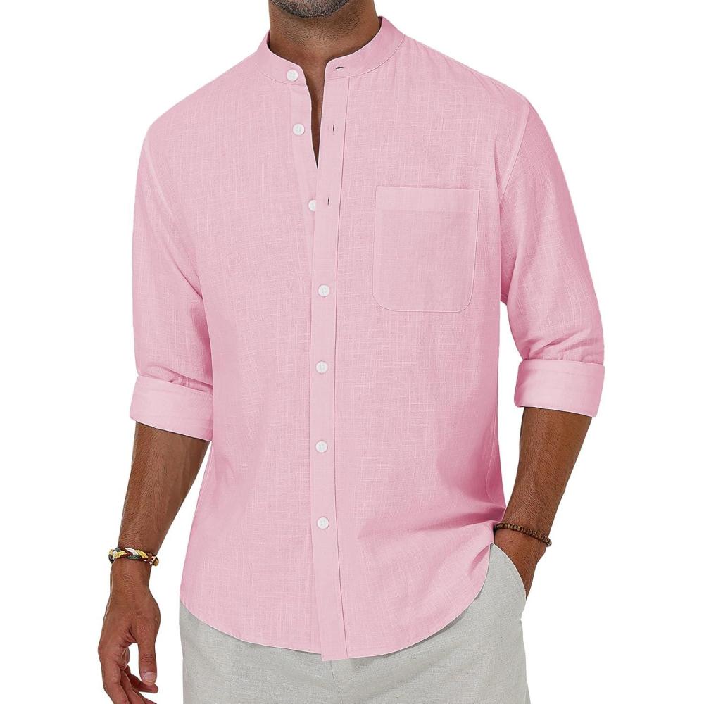 Alimens & Gentle Men’s Cotton Linen Shirts Long Sleeve Button Down Shirt Band Collar Beach Shirts(Pink)