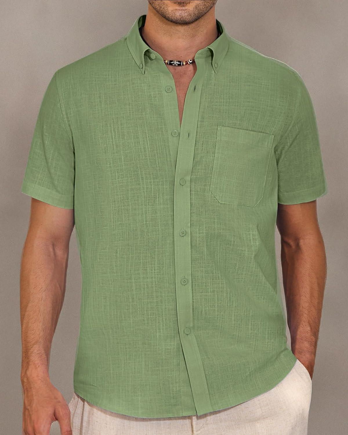 Alimens & Gentle Mens Linen Shirt Short Sleeve Casual Cotton Button Down Shirts Collared Summer Shirts(Celandine Green)