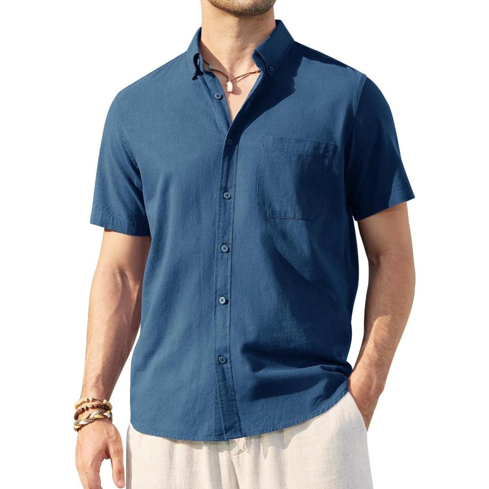 Alimens & Gentle Mens Linen Shirt Short Sleeve Casual Cotton Button Down Shirts Collared Summer Shirts(Misty Blue)