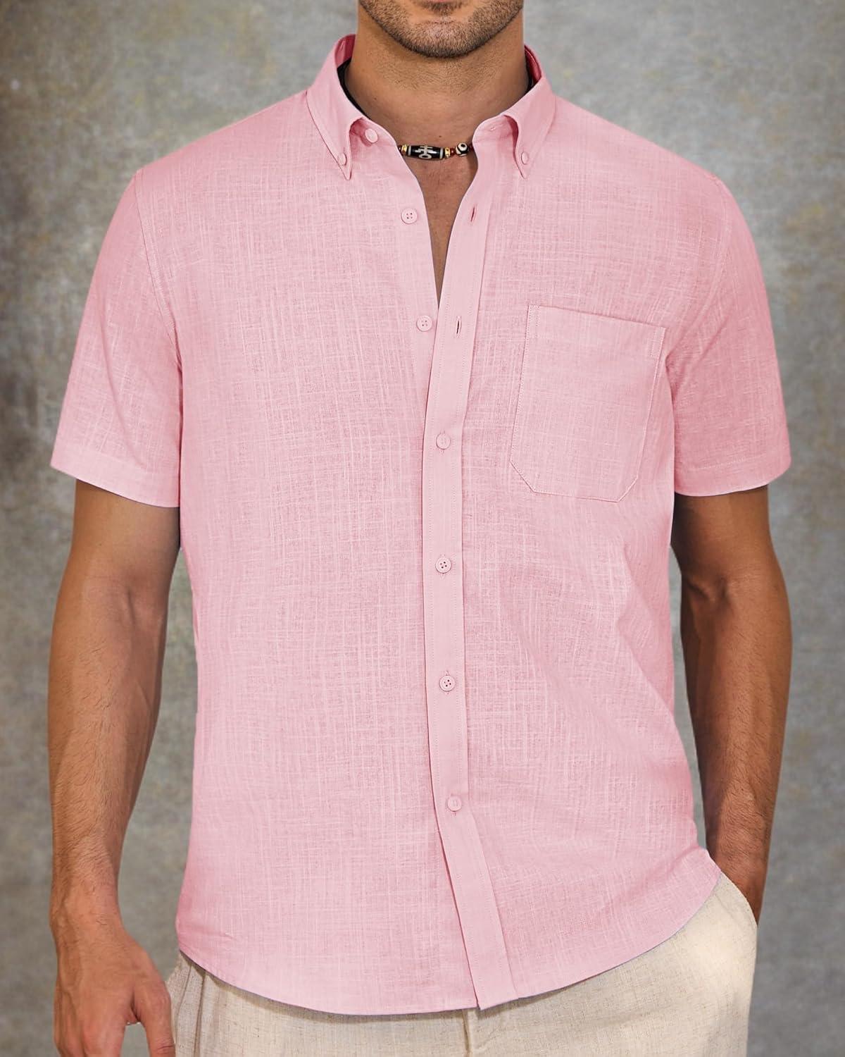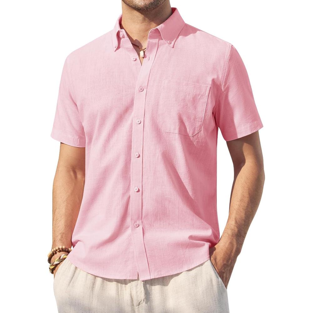 Alimens & Gentle Mens Linen Shirt Short Sleeve Casual Cotton Button Down Shirts Collared Summer Shirts(Pink)