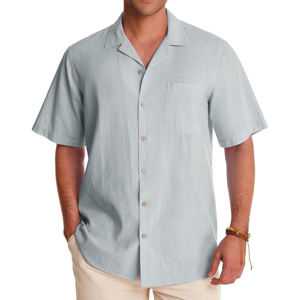 Alimens & Gentle Mens Linen Shirts Cotton Hawaiian Shirts Short Sleeve Button Down Shirts Casual Summer Beach Tops(Grey)