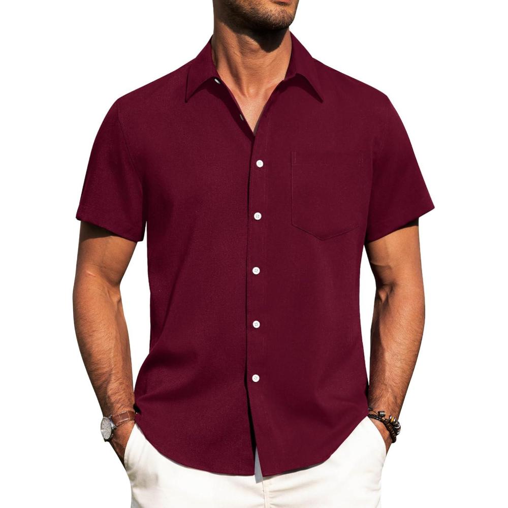 Alimens & Gentle Mens Linen Shirts Short Sleeve Button Down Shirts Wrinkle Free Casual Vacation Beach Summer Tops(Burgundy)