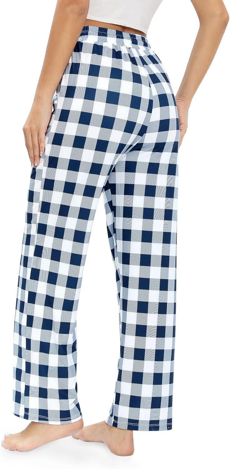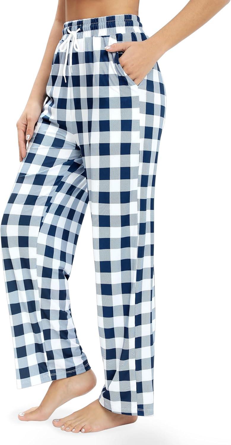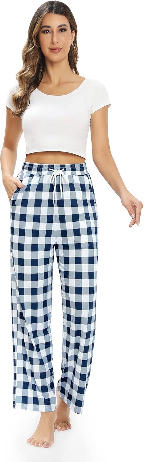 Alimens & Gentle Womens Pajama Pants Plaid Stretch Comfy Lounge Pants Drawstring Waist Sleep Bottoms with Pockets(Navy white)